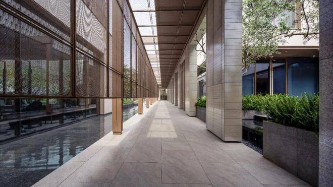 归家路上漫步于水榭光廊,阳光透过格栅在地上形成斑驳的光影,与单侧的水景波动的涟漪互动,让人在潜移默化中,获得身心的舒缓。